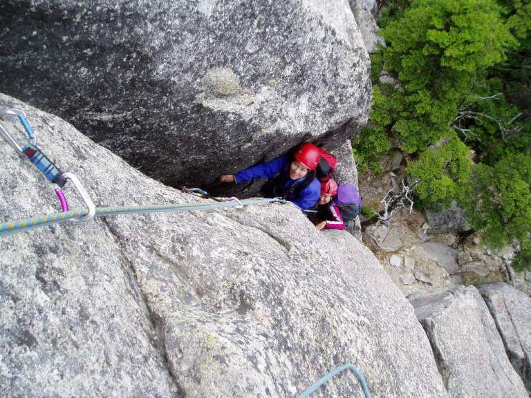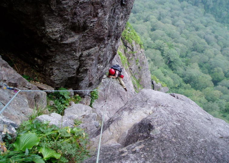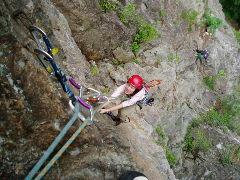 マルチピッチを軽く登ってから人工でハング越えの練習、腕力は要りません。その後はFさんをアパッチハングにぶら下げてユマーリングの練習、と。時々激しく雨が降りますがアパッチハングは大きいので下に居れば大丈夫。