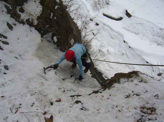 下部は発達がもうひとつでツララ状のため足場悪し。傾斜はしっかり垂直なのでなかなか疲れます。今年のキャンディは例年より高さもあり、10数mくらいかな?各自5、6本づつ登って大満足。