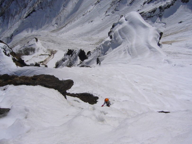 一ノ倉出合に立ってみれば2週間前とは別世界のような雪の少なさで、出合の下まで山のようなデブリ。東尾根の上も雪が切れてブロック状になっていたりして所々悪い。
