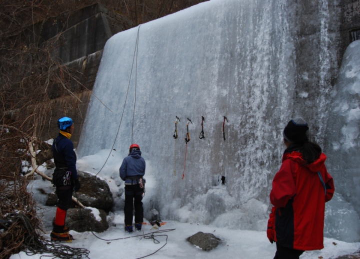 凍ってはいますが水も流れてます。本当に水が流れているので、ロープはたちまち針金みたいな有り様に。下の堰堤もシャンデリア状というか。