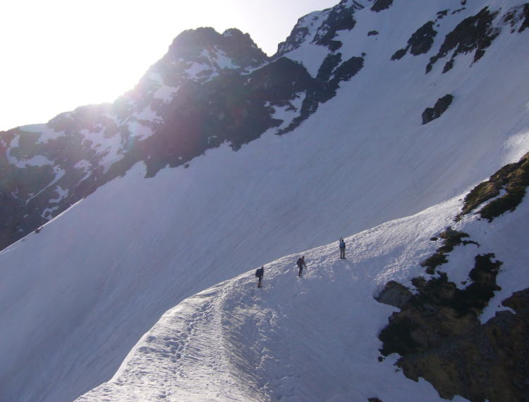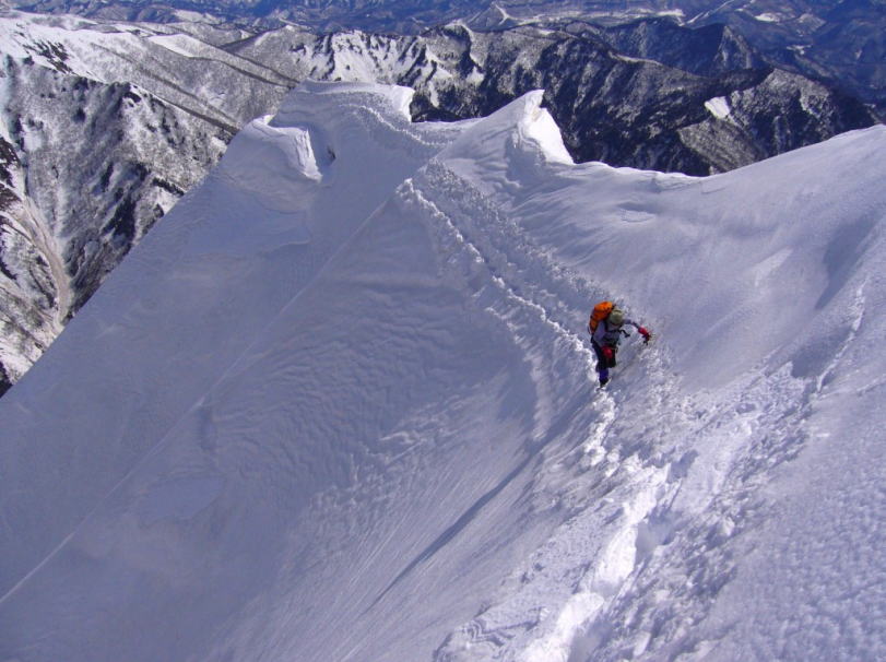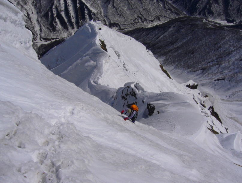 ハイペース故に先頭パーティとなったため延々とラッセルを続けるが、足元の雪庇にクラックが入ったと思った直後に崩壊、あやうくマチガ沢に墜落するところでした。