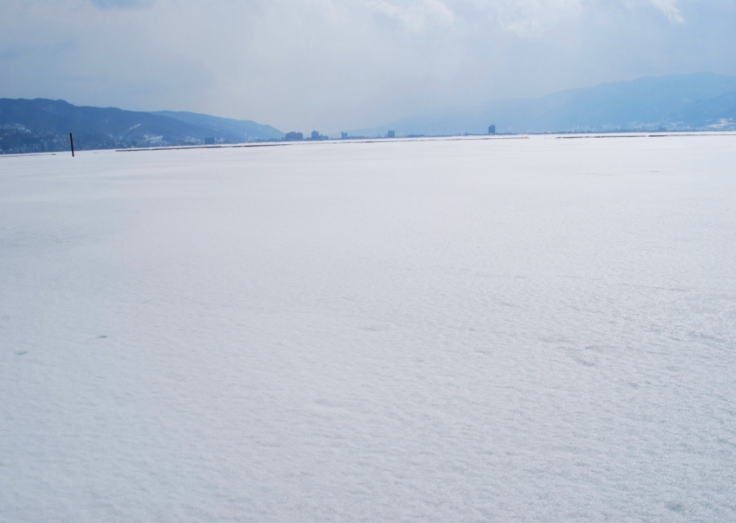久しぶりに訪れた諏訪湖は、一面水平な雪原状になっており日本じゃないみたい。しばし湖上を散策して満足満足。