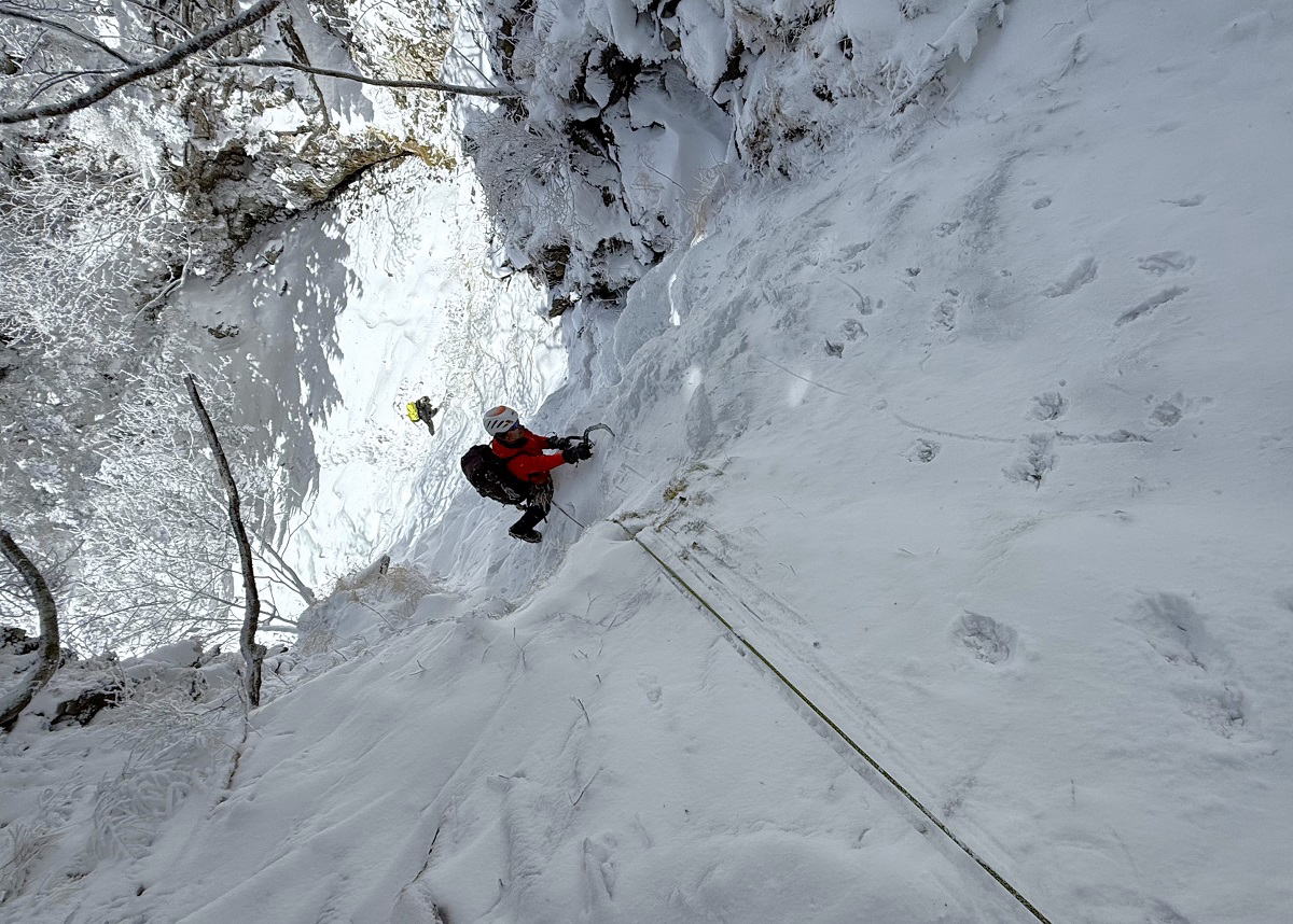 M田さんのリード練習などで少々遊んでから隣の滝へ移動、ソロの方にお断りを入れて先行させていただき、これをリードフォローで登ってから御小屋尾根へ抜ける。