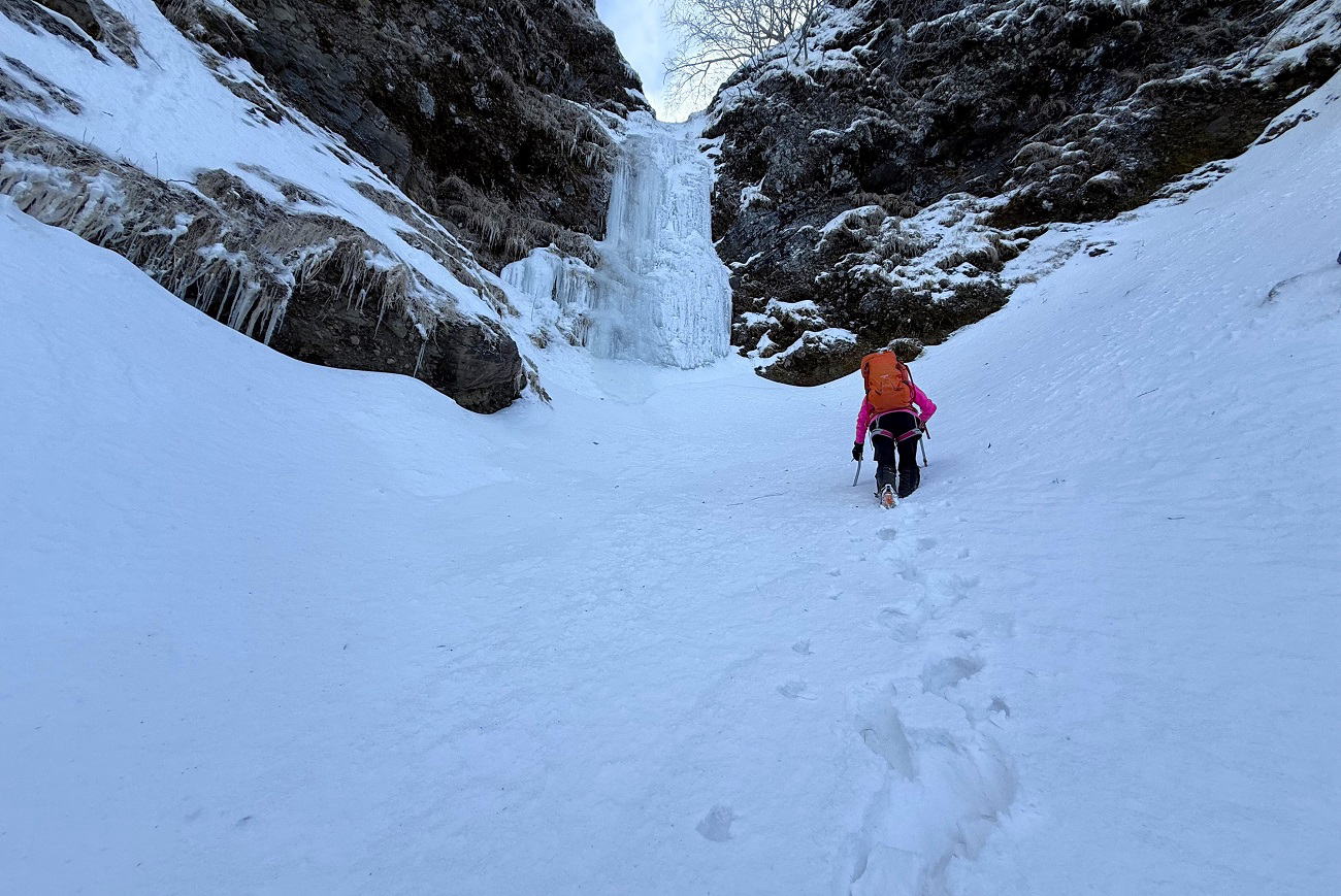 下の小滝を抜けてから上流にはトレース無し、膝下〜膝上のラッセルを強いられて予想外に時間が掛かり、上の大滝に11時。