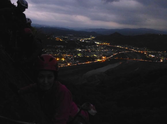 大仁の夜景を観ながら、他の多くのパーティと先を争うように夕闇の中の懸垂下降大会(^^) 暗闇の中で踏み跡にも迷う!今度からどんな時でも絶対ヘッドランプは持ち歩くことを誓います!!