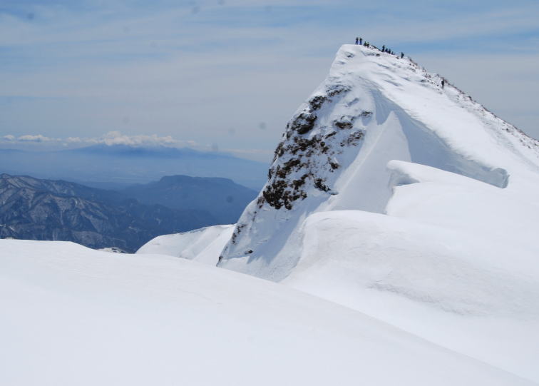静かな西黒尾根とは対照的に、山頂は予想通り混雑してました。オキの耳では雪庇の上を平然と歩くオッサンを目撃。しかも、一人がトレースすると後から次々と皆ついていく。