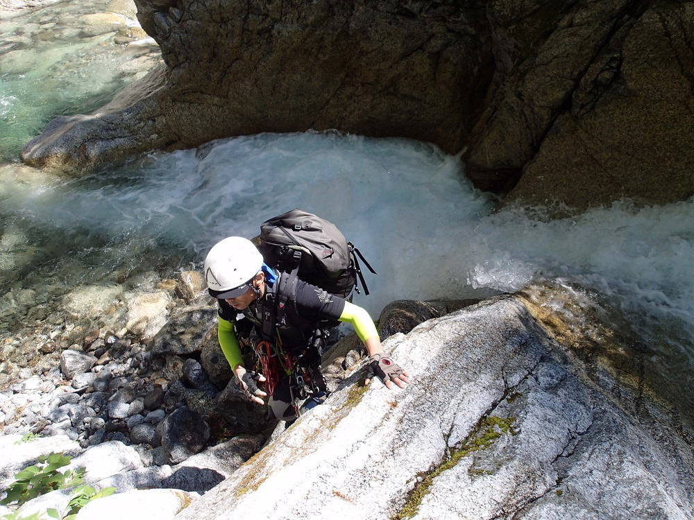 何回か徒渉して最初の本谷核心大岩ワイド着。水ドバドバで、フリー突破は早々に諦め残置スリングを使う。