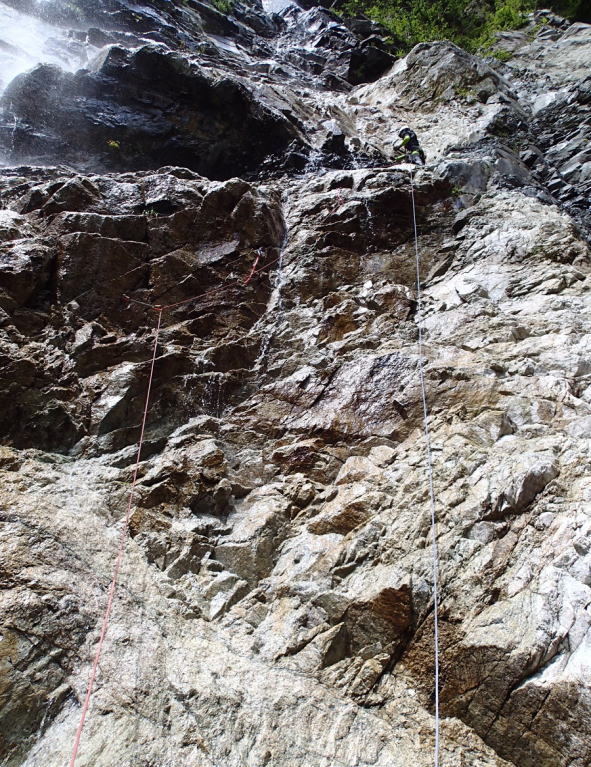 慎重にルートファインディングして、滝左ルートか右ルートで悩むが左はカムは使えるが上部がシャワークライムでランナウトでホールドが未知、相方も草が生えてるクラックは脆いで〜〜との意見。