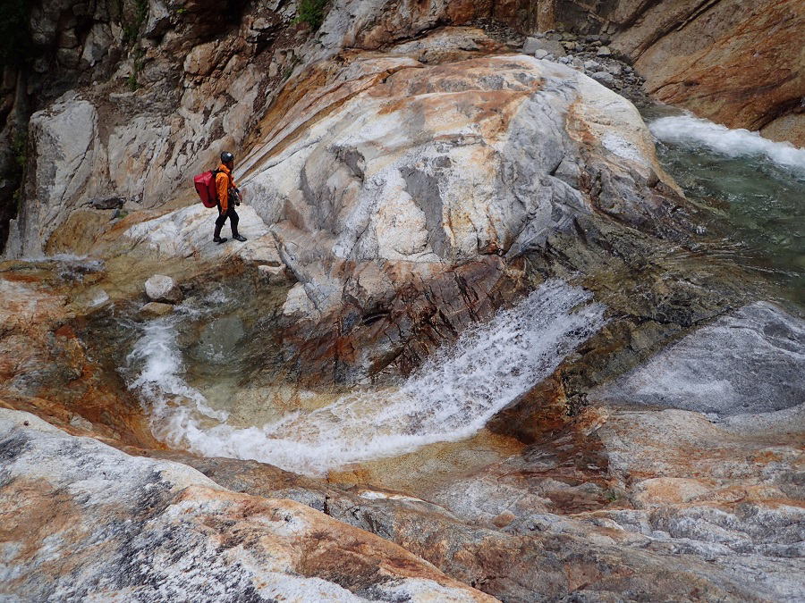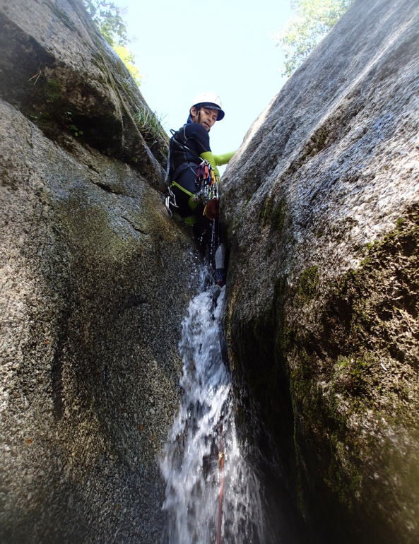 樋状の滝4m手前の10m滝は右壁直上して左にトラバースしたが被っていたので緊張感あった。