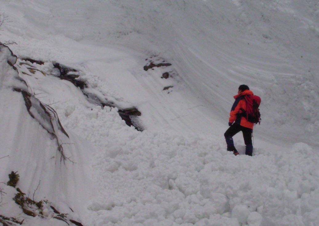 しばらく大門沢を辿ると結構大規模なデブリが出ていた。雪崩れた後の雪面は氷のように堅く、春だな〜といった風情。