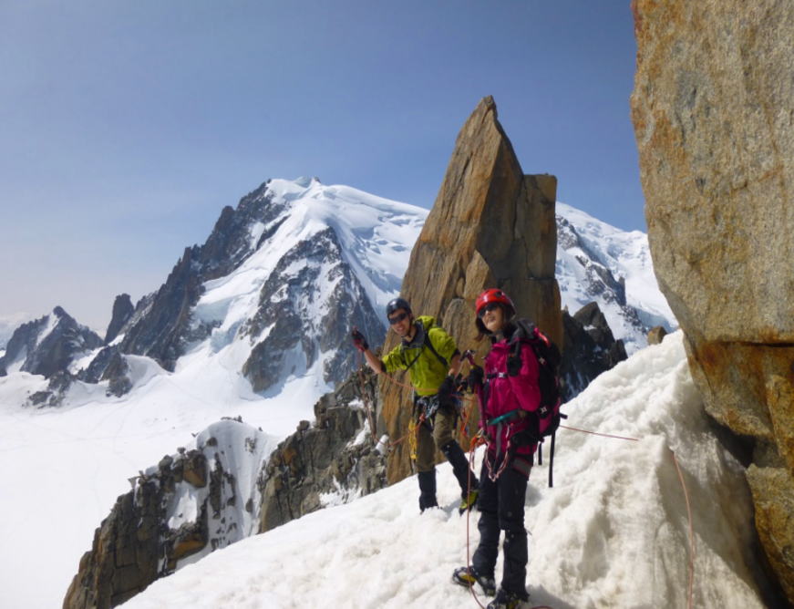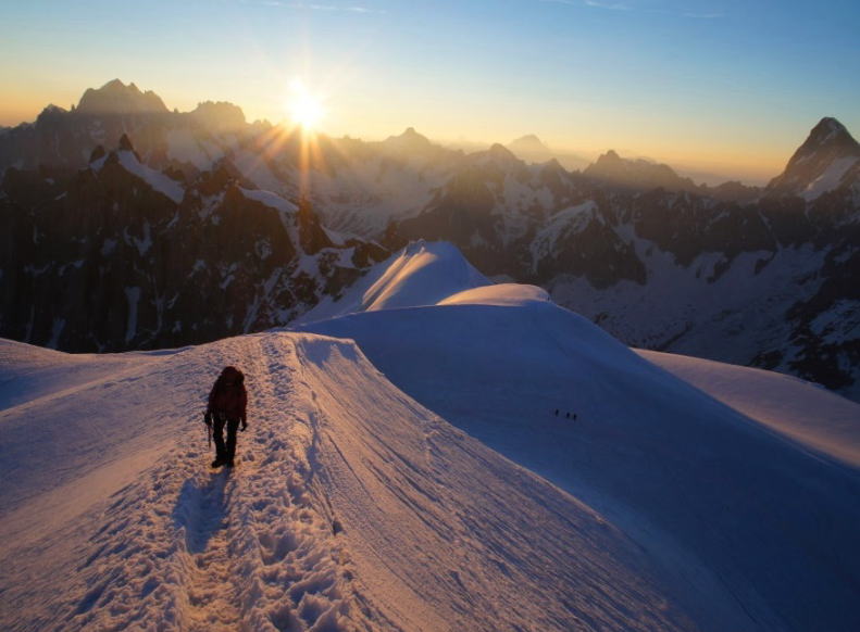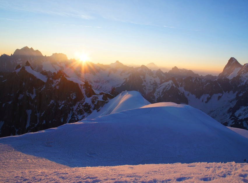 | 7/16 折角だから夜明けのアルプスを堪能して、なお且つシャモニで朝食を摂ろう! というわけで暗いうちにコスミク小屋を出発。 昨日登った壁の基部で記念撮影して、クレバスに注意しつつミディのピークに上がる手前で日の出を迎える。 それはそれは素晴らしい光景で、コスミク小屋に泊まる判断は正解だった! と結果論の自画自賛(^^) シャモニでのんびり朝食を堪能して、あとはお買いものタイムに突入。 |