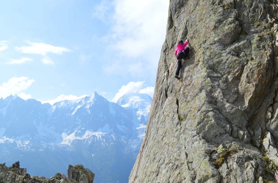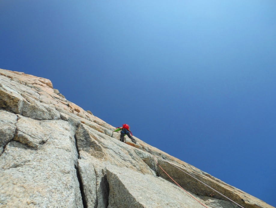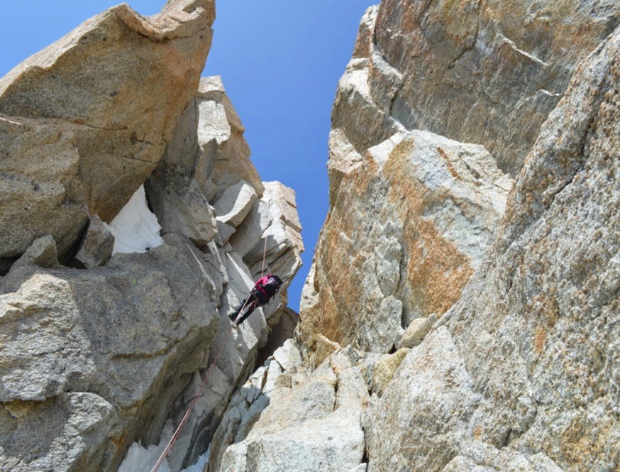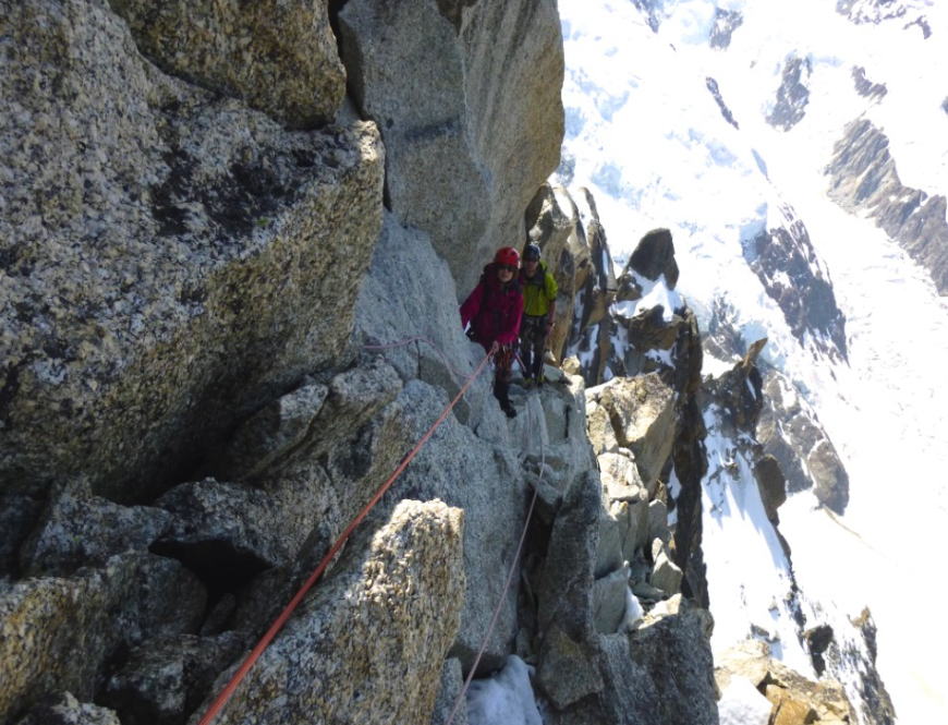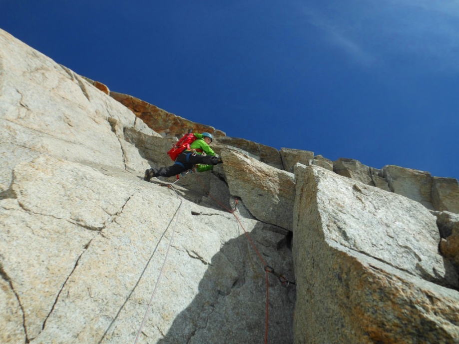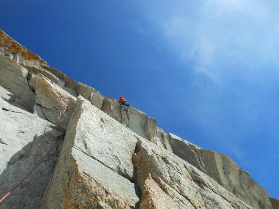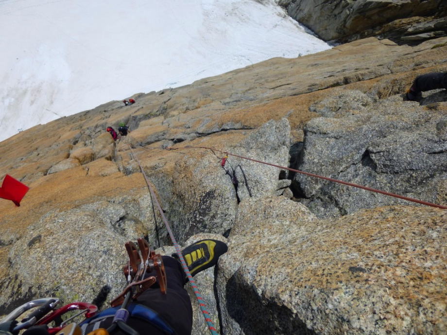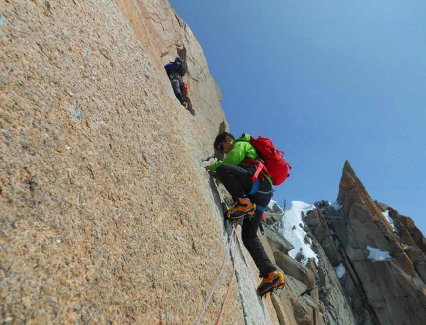 | 7/15 再び朝5時起床。6時半の便でミディへ。今日も快晴、コスミクバットレス(コスミクエプロン、高差150m程の一枚岩)を目指す。 前回Taka氏と来た折には雪が少なすぎて正規ルート外から取付いたが、今回は雪量多く正規のルンゼ状からスタート。 がしかし中々脆い岩で閉口、アイゼンでのクライミングでは意外に悪く感じた。30m程でバンド状に上がることが出来たので、ここでクライミングシューズに履き替え。 記憶を辿りながらリードするが、核心と云われる6aのピッチ手前でルートミス、カムのA0で多分正規ライン?に復帰。 6aのハングでも踏ん切りがつかずA0してしまったが、背中の荷物が重いので勘弁していただきたい(^^) その後も容易とは言いつつクラック主体(5.7くらいかな?)なので3人で時間が掛かってしまい、加えてどこでも登れてしまう壁の構成上、ややルートミスというか進路が判然とせず、 後からきた2人パーティのリードと一緒に正しそうなラインを探しつつ、先を譲ったり譲られたりしながら前進。 フォローの女子に「Nice climbing!」と褒められて、社交辞令と思ってもウレシイ。 なんて云っているうちにエプロンのピークに抜け出たのが午後3時半過ぎ。 これはオーバータイムだなあ、と思いながら後続をビレイ、シャモニへの帰還はこの際潔く諦めて、久し振りのコスミク小屋に一泊することに衆議一致。 一日中晴れていたから良かったものの、ちょっと時間が掛かり過ぎでした・・・ |
