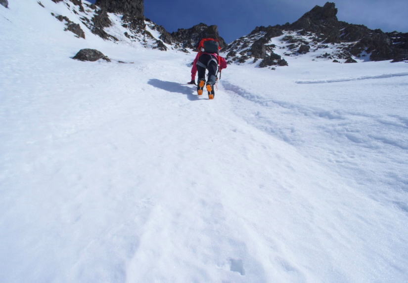 | 阿弥陀からの下りも悪いので一部ロープを出し、綺麗な雪稜になった中岳(の山頂なんて10年振りくらい!?)を越えて午後の部の赤岳へ。 文三郎の分岐点にて、時間も時間なので南峰リッジでも速攻で登ろうかなあ等と話していると、M先輩が「ではロープを出さずに登る」と仰る。 と云うわけで、フリーソロ×2名でノンストップで(止まって寛げる傾斜ではないですが)赤岳まで。 誰もいない赤岳山頂に到着したのが15時10分。握手してからそそくさと下降に移る。 文三郎尾根のクサリや階段は大半が雪に埋まっており、3月のような堅雪の急斜面を慎重に下山。 行者小屋まで下って、本日初めての座って休憩。「疲れた〜」と云いながらあとはのんびり歩いて美濃戸に戻ったのが18時15分。 我ながらスピーディに行動できたと思います。今日もヘッドランプのお世話にはならずに済みました(^^) |