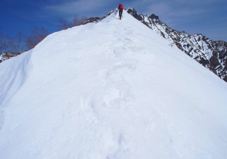 | もともとは泊りの雪山予定でしたが、諸事情から日帰りに変更。 トレーニングしようということで、たくさん歩いてきました。 朝7時45分、美濃戸の駐車場を出発。気温マイナス3度で4月にしては寒い。 行者小屋で身支度して、先ずは午前の部と云うことで、阿弥陀岳の北稜へ。 岩場が始まる直前が、一部氷化した急斜面で悪いのでロープを出す。そのまま伸ばして岩場基部へ。 岩場に着くと3人パーティが先行しており、丁度トップが登り始めたところだった。 おとなしく待とうかな、と一瞬考えたが、今日は先の行程が長いので追い抜かさせていただくことに。 左の雪面からブッシュの急斜面を繋いで登って強引に1P目の岩場の途中へ抜け、ビレイ点に先着。先のパーティのリードにお断りを入れて、ここから先行。 2P目のナイフリッジ部分は雪が消えてボロボロの痩せ尾根と化していた。 ここからはM先輩が先に立ち、あっというまに阿弥陀の山頂へ。山頂着が12時ちょうどでした。 |