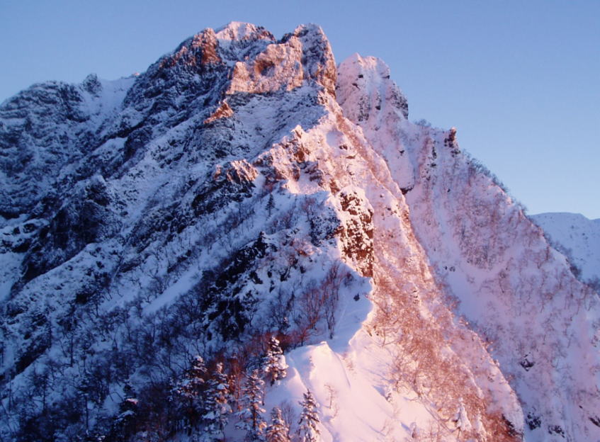 相変わらず快晴、荷が軽くなって快調に尾根上のトレースを辿る。途中東の空に日が昇り始め、阿弥陀や権現や赤岳が染められていく。