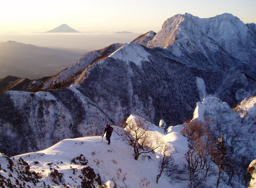 個人的にはこれが今年の初日の出。雲海の上に富士山も浮かび、西の方角には南北中央アルプスの連なりが。次第に植生が疎らになり、尾根が細くなっていく。