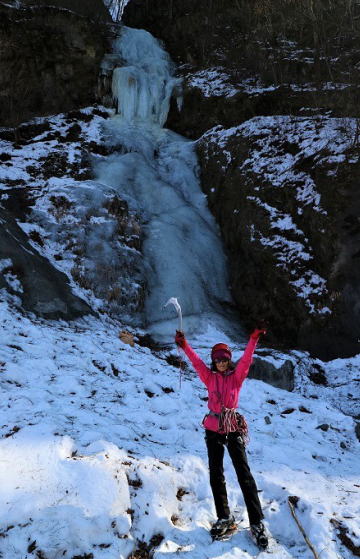 | M姉が「カモシカルンゼ、フォローでしか登ってないのでリードしたい」との仰せで、登ってきました。 桃の木温泉先の林道に車を入れて、朝の8時前に歩き出す。 3回の小さい徒渉を経て、40分ほどでカモシカルンゼF1の下に到着。 ここに来るのは何年ぶりかな? こんなに大きかったでしたっけ、というくらい立派に発達している。 と言うわけで、予定通り姉リードでクライミング開始。 下部の20mほどは緩傾斜でサクサク進むが、中間部の傾斜の強いパートでやや手間取る。 上まで抜けるかな? と思ってみてましたが、傾斜の強い箇所を越えた後、左岸側の立木でピッチを切る。ここまで35mくらい。 フォローで登ってみたところ、傾斜の立った部分はツララの集合体みたいで確かに登りにくかった。 2P目も姉リードで。出だしほどでは無いが傾斜は緩く、特に問題なく登って終了。15mほど。 その先にはF2も続いていますが、トリコルネにも行きたかったのでここから懸垂下降することに。 左岸の立木に残置有り、取り付きまで一発で約50m。 我々が登っている途中に男性2人Pが到着、お待たせしてしまい&落氷を浴びせてしまいすみませんでした。 一旦荷物をまとめて、トリコルネへ移動したのが丁度お昼頃。 混んでるかな〜っと心配でしたが、なんと貸し切り。 早速支度を整えてクライミング開始。こちらは自分リードで。 M姉は昨シーズンの激悪な条件下でリードしているので、もういいとのこと。 下半分は傾斜も弱く氷も柔らかめでしたが、中間で傾斜が立ってくる辺りからが堅い水氷気味。 向かって右側は氷結が甘く表面に水流有り、スクリューは左側に設置していく。 今年のトリコルネは、気のせいか垂直弱のパートが長いように感じました。 35mほどで終了、右岸の立木に残置有り、フォローのM姉を迎える。 今日はもういいかな〜、とも一瞬思いましたが。 いやいや折角ここまで来たんだし、といういつもの貧乏性が出て、ロープをトップロープにセットし直して下降、あとは筋トレの時間。 まさかの貸し切りで誰も来ないので、お湯を沸かしてラーメンを作ったりしながら食べたり登ったりで。 結局4時頃まで登りましたが、何せ30分も歩けば車に着くので、今日は楽勝で明るいうちの下山と相成りました(^^) |