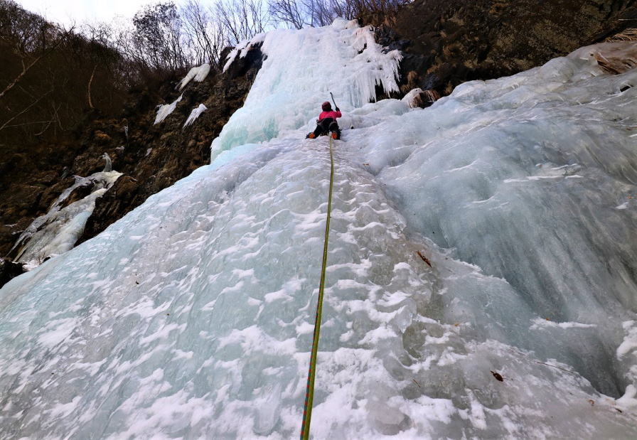 | M姉の今季アイスの目標であった相沢大氷柱リードクライミング。 昨年も同じ目的で来たのですが、大氷柱は水がじゃあじゃあ流れていたので敬遠して、左隣のエイプリルへ転戦したのでした。 今回、2月中旬を目処に計画しましたが、なかなか二人の予定が合わず。 20日、群馬県の天気予報は「曇り午後は一時雨」と非常に微妙でしたが、もう行くときが無くなってしまうので決行。 ひょんなことから雁坂トンネルの無料チケットを入手したので、秩父経由で群馬へ。 朝7時前、相沢登山口にアウトバックちゃんを入れる。 登山道40分踏み跡を30分程度で相沢奥壁に到着。狙い通り誰もいない。 見上げる大氷柱は良く発達しており、中央から右側は水流も一切無く、また表面がデコボコになり比較的登りやすそう。 というわけで、やや緊張気味のM姉に大量のスクリューとヌンチャクを渡し、「時間掛けていいから頑張ってね〜」と送り出す。 ライン取りも全てお任せ。 姉の選択したスタートは、中央より右側の緩傾斜から。 緩傾斜を10mほど伸ばして、一気に傾斜が立ってくる辺りから徐々に壁の中央寄りへ。 垂直弱のパートに入って、10mほど伸ばした辺りで「半分くらい登ったかなあ?」と聞いてくるので「三分の一だね〜」なんて会話しつつ。 登り始めた頃は青空も見えていましたが、この頃から雨がポツポツと当たり始めて嫌な感じに。 更に垂直弱の傾斜を15mほど登っていったんバンド状となるが、その先も更に垂直。 M姉は従来アイスのリードでアックステンションはしない人でしたが。 さすがに今回は、スクリュー設置の際にアックステンションを織り交ぜていました。 終盤、いよいよ雨が本降りに近くなってきましたが、完登まであと僅かだ頑張れ! ということで続行。 結構時間は掛かりましたが、危なげないクライミングで左奥の立木に設けられたスリング残置の終了点まで。 さてフォローの自分は、もう全身濡れてしまっているので、体温が上がるよう最大速度で頑張って登る。 落ちない気安さで二点支持全開、体を振ってアックスを遠くへ打って足を入れ替えて、と必要以上に?全身運動(^^) 雨の中、終了点でお疲れさまの握手。 この天気でトップロープで筋トレするほどイカレてはいないので、懸垂でサッサと下降して帰り支度。 水を吸って重くなったザックを背負い、「また来年も来よう!」と話しながら下山するのでした。 |