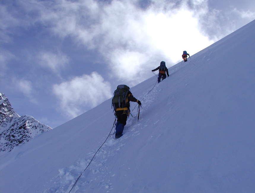 | いきなり総括から… 私自身は以前に一度失敗しているデナリ。今回まずは大沼氏と2人での計画が立ち上がり、他にもメンバーを募る等した末に4人のチームとなった。 風間/金井の両名は海外登山は今回が初めてだったが、其の点について私的には特に不安も無く、また実際の登山でも何ら問題は無かった。殊に風間さんの強さが印象深い。 計画段階の当初に確認した事項として、デナリは基本的に天候の不安定な山であること、従って短いチャンスを逃さず登頂を狙うためには、十分な体力と共に事前の高所順応に留意するべきであることを挙げておいたが、 富士山へ通いつめる等してトレーニングを行い、結果的には絶好の好天を捉えて早期に登頂を果たすことが出来た。 天候のタイミングに恵まれたことが一番だが、メンバー全員が、そのタイミングを逃さず登頂するための準備ができていたということを少しだけ自負したい。 5月25日 曇り 早朝5時半に一宮ICで待ち合わせ。今回は装備が膨大な量のため、メンバーは4人だが車は私と風間さんの2台。KE704便でソウルへ、KE085便でアンカレッジへ。 日本からアラスカへは現在直通便が無いため、なんとも不合理な経路である。 5月26日 曇り ピックアップサービスで登山基地となるタルキートナの町へ大量の装備と共に移動。 その足で国立公園のレインジャーステーションへ出向き、事前に得た登山許可のチェックイン手続きを済ませる。 この街から小型機を利用してカヒルトナ氷河へと入山するのだが、空はどんよりとしており、既に3日間飛行機は飛んでいないとのことであった。 5月27日 曇り 終日エアタクシー会社で飛ぶのを待つが、天候不良で結局この日は飛ばず。 5月28日 曇り 昨日よりは薄日も差し天気が良い。午前中は氷河上の着陸点付近が雲に覆われているとのことで飛ばなかったが、14時過ぎにようやく出発。 ブッシュパイロットと我々4人、登山装備を搭載すると小型レシプロ機の機内は一杯となる。 40分ほどのフライトでカヒルトナ氷河へ着陸。晴れ間ものぞき天候は回復傾向のようだ。 ここからは各自背中のザックの他にソリに荷物を積み、一人あたり合計40〜50kgの荷物を運搬しなくてはならない。 クレバスの多い氷河上の行動なので当然アンザイレン。 ソリはプルージックでメインロープからバックアップを取っておく。こうすれば、本人がクレバスに落ちた際に頭上から重いソリが降ってこないのである。 15時50分、支度が整いいよいよ歩き出す。今回のメンバーの中では私が一番氷河を歩いているので先頭を務めさせていただく。 この日は3時間強の行動で、カヒルトナ氷河イーストフォーク出合にてテントを張る。 5月29日 晴れ 基本的に夜も暗くはならないのだが、日が高くなってくると氷河上は暑くて死にそう。9時50分出発、延々と続く氷河をひたすら遡る。 傾斜が出てくるにつれてソリの荷重で腰が壊れそうである。あまりの暑さと氷河の長さに負けて、この日はカヒルトナドーム付近の標高2900m辺りでテントを張る。 5月30日 晴れ 11時半出発。単調な氷河の斜面をひたすら登り、14時半に標高3300mの通称デポキャンプ着。 ここは広い雪原で、この先地形が険しくなりスキーやソリをデポしていくパーティが多いためこの名で呼ばれている。 5月31日 曇りから雪 今日は荷上げの日。テントや燃料をザックに詰めて9時50分出発。いきなりの急登で始まり、ウィンディコーナーに13時。日があまり差さず、風もあるため少々寒い。 コーナー付近から上部にかけてはクレバスが多くなってくる。 15時、かなり疲れてようやくABCとなる標高4300mのプラトーへ到着。多数のパーティが既にテントを張っており春の涸沢のようだ。 雪が降り出し一気に視界が悪くなる中、雪面に穴を掘って荷上げした装備を埋め、目印の旗竿を立てて下降に移る。下ると速く、17時過ぎにはデポキャンプに戻った。 6月 1日 曇りから雪 今日はABC入りして、以後登山終了までの間はABC以上での行動となるため、帰路のための装備のみをデポキャンプに埋め、残りの装備一切を背負って10時半に出発。 雪が降っているが行動中は暑い。荷物が重く時間がかかり、16時半にABC着。テントを3つ張って広々と過ごす。 6月 2日 雪 本日は休養日。高所順応のためにも大事なことであり、またお誂えむきに天気も悪い。雪は終日降り続いたが、幸い積雪量はさほどでもなかった。 6月 3日 雪から晴れ 明け方までは静かに雪が降っていたが、その後急速に快晴となる。高気圧に覆われてきた様だ。 今日は順応の為にウェストバットレスのコルまで往復。11時出発、ABCから急な雪の斜面をひたすら登ると、固定ロープの設置された雪壁となる。 ここで高度は既に4700m程だが、快晴無風で暑い。 今回はロープを有り難く使わせていただくが、雪に埋もれたロープはユマールのカムをすぐに滑らせてしまうためにあまり信用できなかった。 13時45分ウェストバットレスの尾根上に出る。 標高約4900メートル、自分