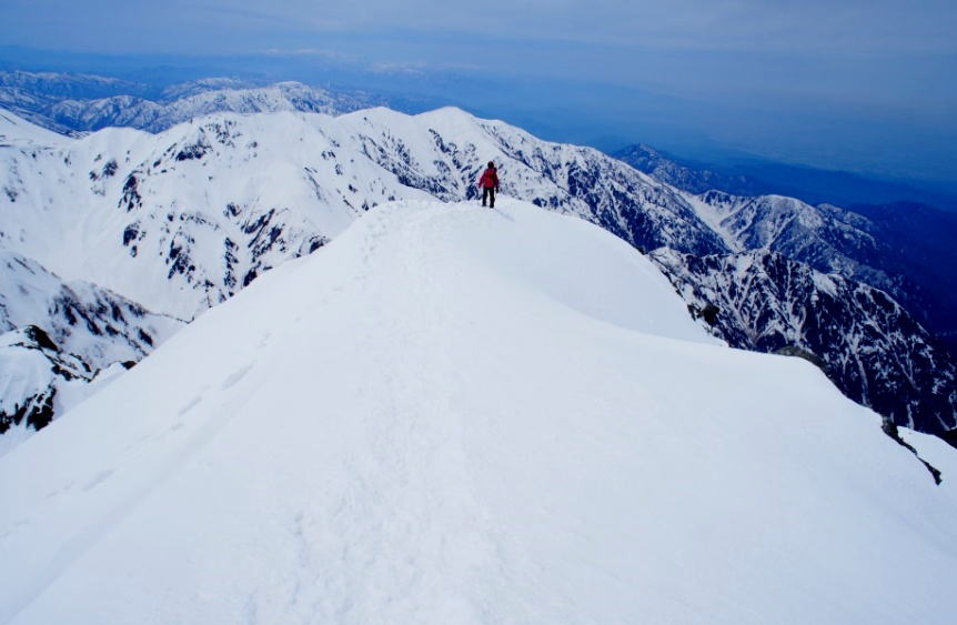 今年のGWの剱岳合宿は、当初の予定では4名で八ツ峰でしたが、若干経験値的な不足感もあり、源治郎と八ツ峰の2Pに分散することに。 結果的には、それぞれのPがスピーディに目標のルートを登ることができました。 5/3 前夜26時過ぎに立山に到着、正味2時間程度しか寝ていないので別山乗越までの急登がしんどい。 午前中は概ね晴れていたが、予報されていた通り昼過ぎからは風が強まるとともに視界が悪化、剣沢にてテントを張るころにはミゾレ混りの強風となった。 今回メンバー4人の息が合っており、整地からブロック積み上げまでの作業が非常にスムースで、立派な物件が完成。明日は早いので、軽く飲んで就寝。 5/4 3時半頃に起床、4時半過ぎに出発。心配していた風は収まっており、雪面は固くクラストした絶好のコンディション。 薄明るい剣沢を下降して平蔵谷出合を過ぎ、直ぐに源治郎尾根取付きの急峻な雪のルンゼへ。ここで八ツ峰Pとは、お互いの健闘を祈りしばしのお別れ。 ギアを身に着け、5時半過ぎににルンゼの登行を開始。ルンゼ内はまだ日が射さず、雪面は非常に硬い。 ロープは出さずにスピードを上げて高度を稼ぎ、傾斜の強まったルンゼ上部を左に抜けて小さな岩場を越え、緩い雪稜から雪壁を越えて7時半に1峰のピーク頂上へ。 長次郎谷を挟んで八ツ峰の鋭い稜線が実に美しい。「2人はどこまで登ったかな〜」等と話しつつ、しばし見惚れる。 ここから数10mの急なクライムダウンを経て、2峰の急雪壁へ取付く。今年は雪が少ないようで、ところどころ岩が露出しているが問題無し。 8時半に2峰のピークに到着。 1峰の登りで既に先行Pに追いついてしまっていたが、この先の懸垂下降で待たされることが判っているので、2峰山頂で景色を見ながらゆっくりと休憩。 懸垂下降の支点までは下降気味のナイフリッジで、実は本ルートで一番緊張する箇所かもしれない。 M先輩も少々腰が引けてはいたものの難なく通過、しっかりした支点から25mの懸垂下降。 降りきったコルでロープを畳み、あとは単調な雪面をひたすら登り、10時40分に待望の剱岳山頂へ到着。順調でした。 結局、2峰の懸垂以外ではロープは一切出さずに全て同時行動したこともあり、取付きから剱岳山頂までちょうど5時間、懸垂のために30分以上待たされたことを考えれば、かなりのスピードで源治郎尾根を登ることができた。雪の条件が悪くなる前に安全圏へ抜けるために、スピードは大事である。 天候は再び下り坂が予報されていたため、ほんの一息入れた後は直ぐ別山尾根の下降に移る。 平蔵のコルからは平蔵谷を降り、やがて剣沢に降り立ったあとはBCまで延々と登り返し。 ビールでも買おうと剣山荘へ寄り道したところ、小屋が未だ営業していなかったのには大いに落胆しましたが、14時半過ぎに無事テントへ帰着。 八ツ峰Pの荒木氏は既に到着していました。八ツ峰完登して正午には山頂にいたとのこと。早え〜 この夜はすっかり寛いだ気分でお酒もすすみ、M先輩が準備してくださった夕食もナイスで、楽しいひと時を過ごす。 |