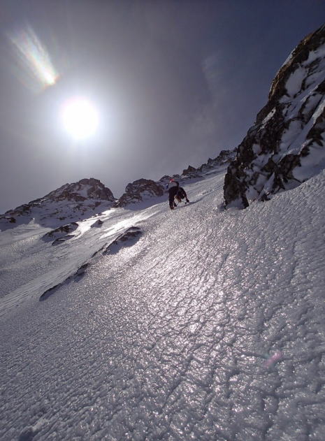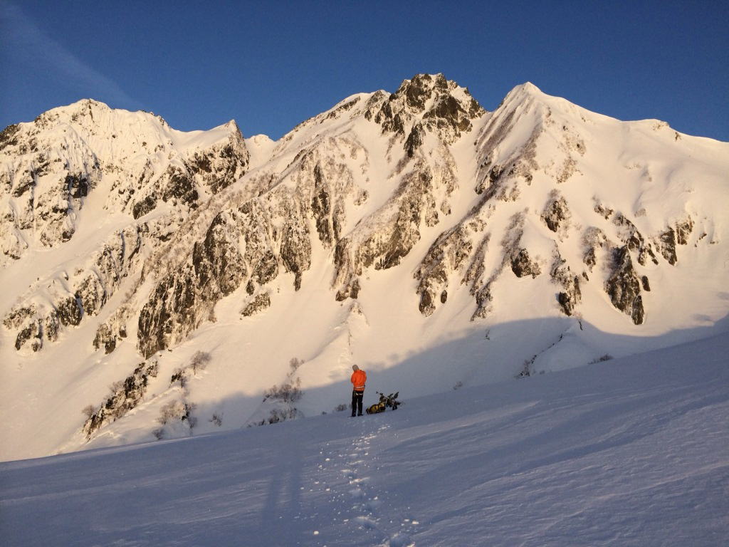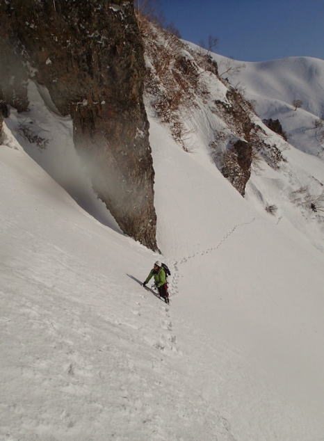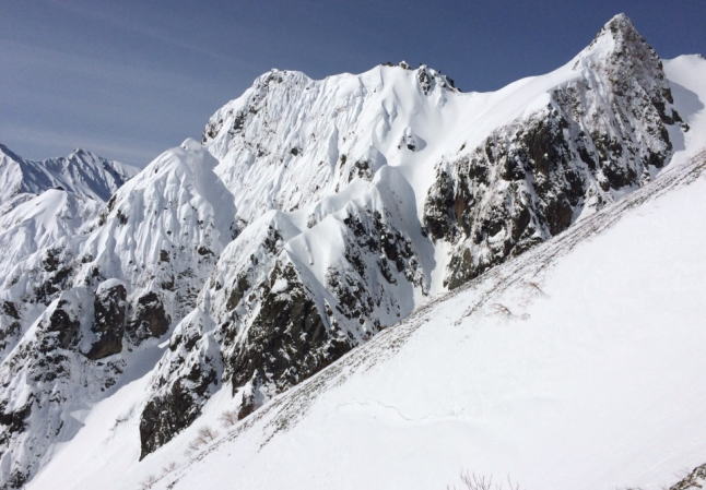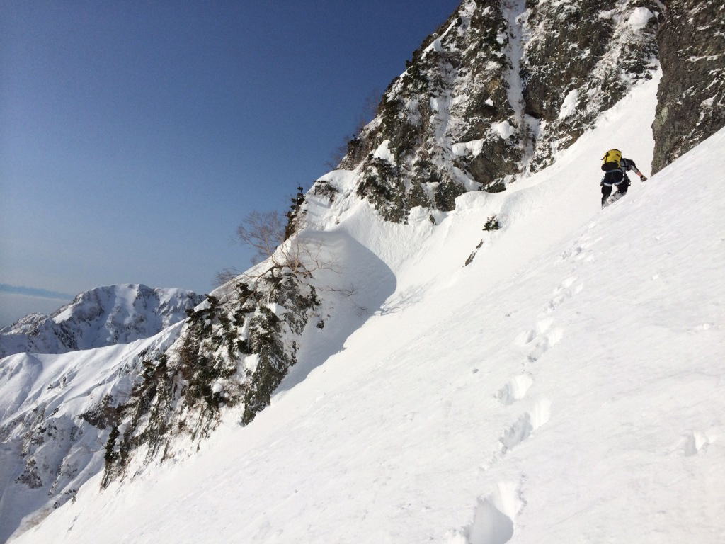 | 前日の雨が心配だったが行って見なくちゃわからない、という事で平日一泊でG2へ。 31日 テレキャビン8:30〜西遠見13:30 中遠見から西遠見が暴風で、斜め45度歩きを強いられる! テンバは木と木の間に風に備えて完璧に作った。強風で雪が飛ばされたのか、新雪は15センチ程度と感じた。 夜は凄まじい風の音で目が覚める事も多かった。 1日は4:15分起床〜雪がしまっていて、天気は最高で、これなら行ける! ここから完全ノートレースで西遠見からの支尾根から白岳沢へ下り、A沢をトラバースして中央稜取付きの真ん中のルンゼ目指して素早く行動した。 核心は中央稜に出るまでの4ピッチだ。近くでルンゼを見ると始めはノーロープで行けそうなので、中村さん先頭で取付いた。 予想どうり快適だったが、一カ所ブッシュで雪ズボズボの所があった。中村さんはここが沢っぽくて面白かったと言っていた。 その後も先行きます〜の声^_^ 稜に出る10メートル程が悪いと言う事で少し右から私が先に稜線に出る、マントル部分が面白いと感じた! 結局全てノーロープとなったが、上から見ると結構立っており、ロープ出した方が良かったかな〜と少し思った。 が、雪質良かったのでこれで正解でしょう〜とお話^_^ 似たような精神と登攀力同士だと、本当に登りやすい! ここから先は武田菱まで快適安全登り、G2の頭に9時ごろ到着。 ここで長野県警ヘリが飛んできてホバリングしている。確かここで滑落した方が今だ発見されておらずその捜索と思われる。 改めて自分たちは生と死の分岐点に居るんだと気を引き締める。 が、ここから上にデカイ雪庇と、先が崖っぽかったので下ってトラバースを選んだら全然巻けない! 雪壁を100mくらいトラバースしたような~所々アイスバーンがあったがダブルクウォークは安定感抜群で、ありがたかった。 本峰手前のルンゼを詰めて稜線復帰するが、1・5時間のロス!G2よりこちらのトラバースが本当の核心に思えた。山頂は素晴らしく360度絶景でした。 テレキャビンの時間があるので、正規ルートで下山〜トレースがほぼ無いので、最悪スキー場歩き下山が頭をよぎる。 11:40〜テンバ14:00〜テレキャビン16:05到着15分遅かったら歩きでした。下山中取付きへの一直線のトレースが見えて、感慨深かった。 今回の山行は風邪気味だった事もあり体力的にハードだったが、良い経験になったと思う。 誰もいない雪山最高でした!G5に北壁行けるように日々精進あるのみです!中村さんありがとう! |