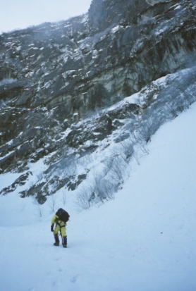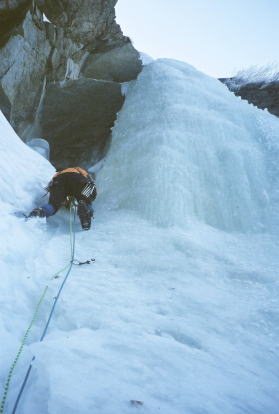古屋氏の登攀中に滝上部に虹がかかって、あの写真はかなり最高のアングル。(だと思ったけど、現像した写真は大したことなかった。というか、虹が写っていなかった。)