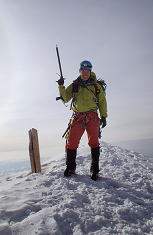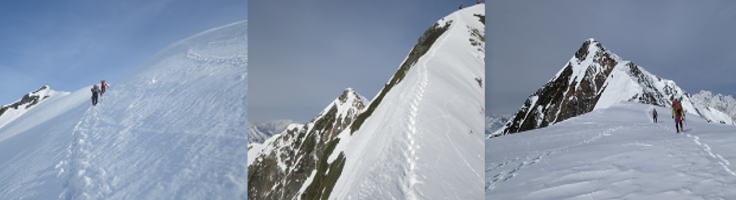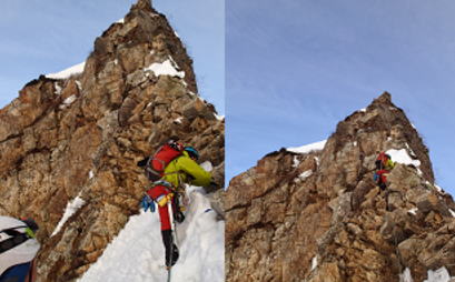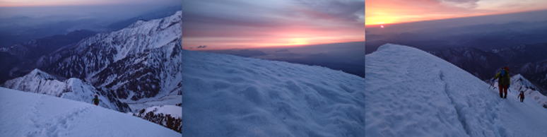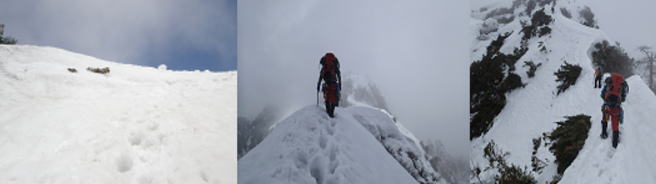 | 第二岩峰、深川。全装備背負ってのクライミングだったが重さを感じずオールフリーで快適に終了した。 あえて言うなら、真ん中が少し悪かったかもしれない・・・ 第二岩峰から頂上までは、高度感のある雪陵の登高を三人とも思い思いに登り北峰2842mに到着。三人笑顔でガッチリ握手。 |