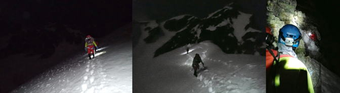 | 4/20(日)1:00起床・テン場撤収 2:30出発 取り付きに、3:30到着 今回三瓶氏は写真撮影の為、終始フォローとのことで立野氏とジャンケンでリードのスタートを決めた。 勝った私は、ハイライトの岩峰のクライミングを頂いた。 夜間登攀スタート 第一岩峰、立野氏。凹かくのクラストしたと雪壁を順調に50mいっぱいにザイルを出す。 雪壁登攀は、雪が締まっており快適で気持ちが良かった!! 中間は、ノーザイルで3人とも第二までコマを進めた。 |