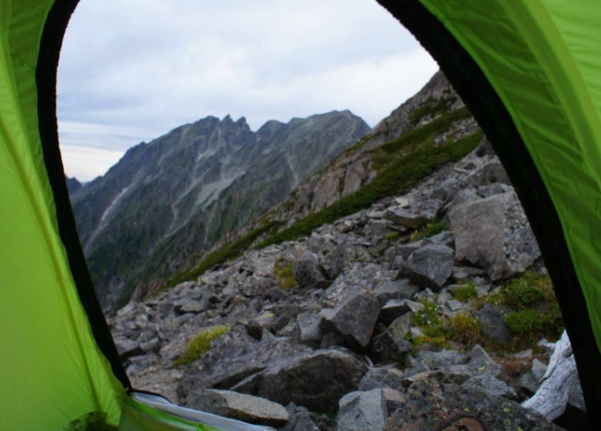 | 9/6 晴れ時々曇り夜は雨 朝5時に先輩をピックアップ、一路沢渡へ。タクシーに乗り換えて上高地に7時半到着。肌寒い中、支度を整えて8時ちょうどに出発。 岳沢へ向かう登山道を30分ほど登り、南西尾根入口に張られた黄色いロープを跨いだあとは、ひたすら顕著な踏み跡の急登でところどころヤブあり。 軽量化を全然考えていないのでザックが重いが頑張って歩を進め、11時過ぎには5峰手前の台地に到着。 テント4張り分くらいは綺麗に整地されており、森林限界を抜けており展望良く快適そうだが、先を急ぐ。 5峰からの下降はやや迷ったが、少しだけ岳沢側に下り、岩の間を通るようにトラバース気味に稜線へ戻る。 比較的なだらかな山容の4峰へはしっかりした踏み跡あり、これを越すと明神主稜線の核心部が一気に視界に入る。 岩壁状の3峰、鋭く尖った2峰と主峰が等間隔で並んだ姿はかなり格好良く、一気にテンションが上がる。 3峰は最後まで直登せず小さく岳沢側を巻いた。トラバースと云いつつ多少のアップダウンあり、ルート探しが面白い。3峰を通過したのが14時過ぎ。先を急ぐ。 振り返ると、3峰は岩のドーム状で異様な形状をしている。 2峰の登りは大岩の積み重なった急斜面で、登りやすいところを選んで行く。 ピークをやや過ぎたところに岩角とハーケンの下降支点あり、20m程度の懸垂を2回で15時ジャストにコルへ降り立つ。 またまたガラガラの急斜面を頑張って登り、15時30分、ようやく明神岳主峰の山頂に到着。お疲れさまでした。標識も何にもない山頂からは、穂高の稜線が至近距離に望まれて素晴らしい眺望。 明神岳から先はかなり踏み跡が明瞭で、ここまでのようなルート探しは不要となる。 最低鞍部への下降にもしっかりした残置支点あり、短い懸垂を2回行ったが、ここはクライムダウンで良かった気もした。積雪期のための支点かな? 最低鞍部で時刻は16時過ぎ、土地探しをしながら歩いてきたが、ここで平坦な良い物件を発見したので、今宵の宿に決定。 ちなみに主峰のすぐ下にも3カ所ほど整地跡があったが、地形的に落石が心配で落ち着かなそう。こっちのほうが安全でしょう。テントの窓から穂高が望まれる最高な環境です。 テントを張り、荷物を片付けて落ち着いた辺りから雨が降り始める。明日の天候が若干心配だが、ひとまずは行動中に降られなくてラッキー。飲んで食べておやすみなさい。 |