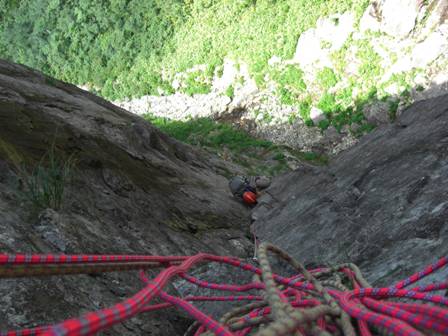 この壁は直上せず、切り立つ壁の右側凹角、またはその右側スラブ上に走ったクラックを利用するのが多いようである。ここにも残置ロープはあるが、やっぱり使うべきではないでしょう。