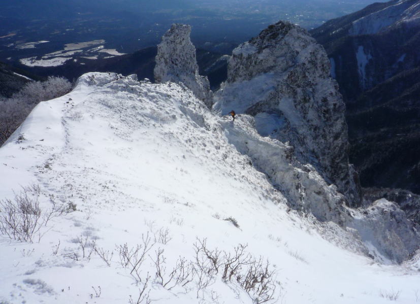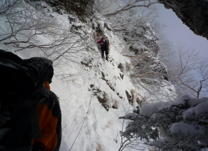8時前にカニのハサミ状岩峰を通過、その先の小岩峰をロープ無しで通過中に、前にいた深川さんが突然降ってきてアイゼンで右手を踏まれてしまう。痛い痛い。次の岩峰は右の固定ロープ部分から巻いて通過、自分たちのロープは出さずに行くが、切れ落ちた急傾斜のトラバースでなかなか悪い。トラバースから雪の急斜面をしばらく登ると尾根上に戻り、いよいよ大天狗へ連なる一連の岩場へさしかかる。大天狗手前の岩場は左にバンド状をトラバースしてから容易な岩場を一応確保して登る(下りではロープを出さなかった)。岩尾根を右から絡むように進み、9時半過ぎに大天狗の基部へ。