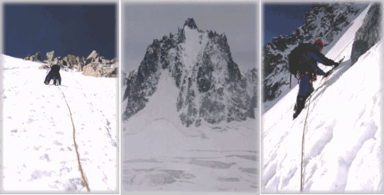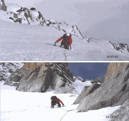 | シャモニへ移動した我々は、早速高山事務所へ足を運び、係の兄ちゃんに山のコンディションを尋ねた。 「ツールロンド北壁とダンデュジェアンを登りたいが雪の状態はどうか」「ノープロブレム。グッドコンディション」 こんなやりとりを、天気待ちの間に都合3回ほどしたか。 いつ尋ねても答えは一緒。それしか喋れないんじゃないだろうな。 シャモニの街は連日夕方から雨、針峰群も見えない。半信半疑のまま、明日は晴天との予報が出た26日、ミディへあがる。 ところがショックなことに、エルブロンネルへのゴンドラが、強風のため止まっている。 いきなりバレブランシュを歩いて横断する羽目に。 ミディの駅からロープを結び、ミディのコルへ細い雪稜を下る。 トリノ小屋まで約3時間、一度歩いてみたいと思ってはいた氷河の旅だが、アップダウンが激しく、予想外に疲れてしまった。 翌27日、朝4時に起床、食事を済ませて、明けかけた5時過ぎに行動開始。 トリノ小屋からすぐにロープを結び、1時間ほどでツールロンドの基部へ。 ノーマルルートを左に見送り、デブリのでた北壁の取り付きに着く。 身支度をして、7時過ぎにスタート。 最初の緩傾斜部分はコンテで進み、大森君のリードでシュルントを越えて、以後交互にリード。 氷質は表面がシャーベット状で、少し掘るとややましな氷が出てくるといった変則的な物。 足は何度か蹴り込むとステップが出来たが、バイルのピックはあまり効かず登りにくい。 全体に不安定な感じはしないが、アンカーの支点を得るにも氷の表面を削ってスクリューを使用したり、ピッケルをT字に埋めたりと手間がかかる。 2時間弱で壁の中央の、岩とのミックス部分に到達、この辺りは岩に残置も散見され、またクラックが多く、支点にカム類を使えた。 中間部は日が当たらず、傾斜もあるせいかルート中で最も氷質が良かった。 上部は雪壁の右寄りを登り、11時前に北壁を終了、壁の上辺の雪稜を2ピッチで左へトラバースし、さらに岩場を2ピッチ進む。 岩場が一カ所難しかったが、大森君の機転で投げ縄をして首尾良く突破、13時すぎ、ノーマルルートに合流した。 予想以上に時間がかかってしまった。 下降はノーマルルートの緩い雪稜を下り、最初のコルを左へ下って今朝のトレースに戻る。 時間がかかってしまった要因としては、我々のスピード不足に加えて、壁のコンディションが予想と違っていたことだろうか。 堅雪の壁と所々の氷を想定していたが、表面の腐った氷というか、日本ではあまりお目にかからないような代物だった。 ともあれ、これで今回の目的のルートを一つ登ることが出来た。 先を急いだため、二人とも結構息の上がる状態だったが、大森君がロープを組んでくれたおかげで、不安なくルートを登ることが出来たことを感謝したい。 (古屋・記) |