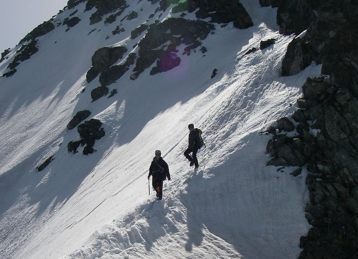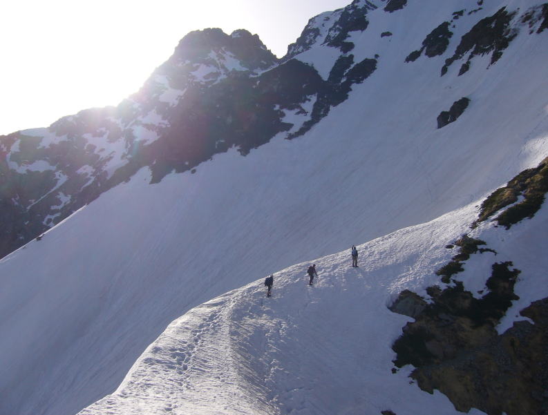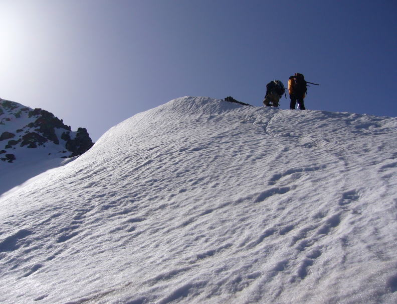 気温が高くすでに雪が腐っているため、アイゼンの爪を利かせてぐいぐい登るというわけにはいかないが、それでも立派なトレースに導かれて順調なペースで高度を稼ぐ。