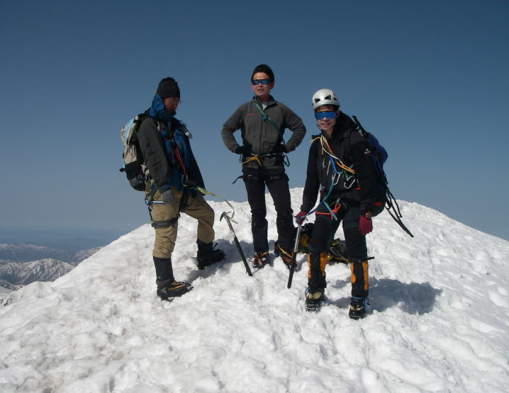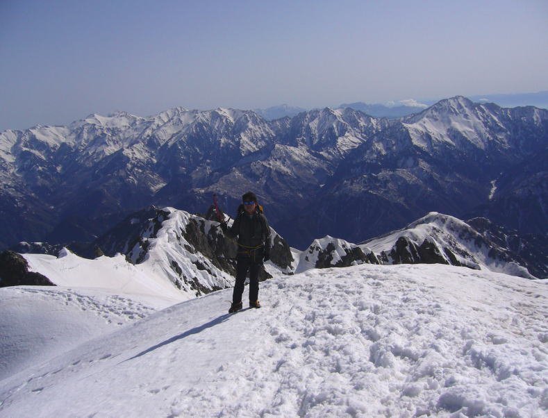 山頂にはちょうど誰もおらず、雪のため三千メートルを超えた山頂を4人で独占する。八ッ峰や後立山を始め、360度の展望をバックに各自さんざん写真を撮りまくったのち強風の山頂を後にする。
