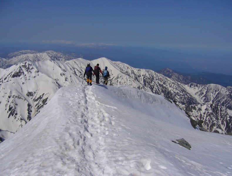 雪の早月尾根は4人とも初めてであったが、長大な尾根も予想外の短時間で終了した。それも快晴と連休後半故の立派なトレースのおかげだろう。